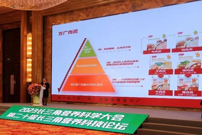 在2023長三角營養(yǎng)科學大會上,著名兒童營養(yǎng)專家,來自上海交通大學醫(yī)學院附屬新華醫(yī)院的盛曉陽教授做了“肉泥作為嬰兒首選輔食研究”報告,與大家分享新版《中國居民膳食指南》中建議嬰兒輔食中首選添加肉泥、肝泥、強化鐵的嬰兒谷粉等富鐵的泥糊狀食物的意義,尤其是重視添加肉泥類食物,主要是為了引起家長對肉泥類輔食補充鐵和其他優(yōu)質(zhì)微量營養(yǎng)素的重視,改變輔食就是米粉的錯誤理念,為嬰幼兒喂養(yǎng)提供科學指導。盛曉陽教授講課中例舉了揚州方廣最新研發(fā)的嬰幼兒肉泥系列產(chǎn)品,適合作為嬰兒輔食使用。