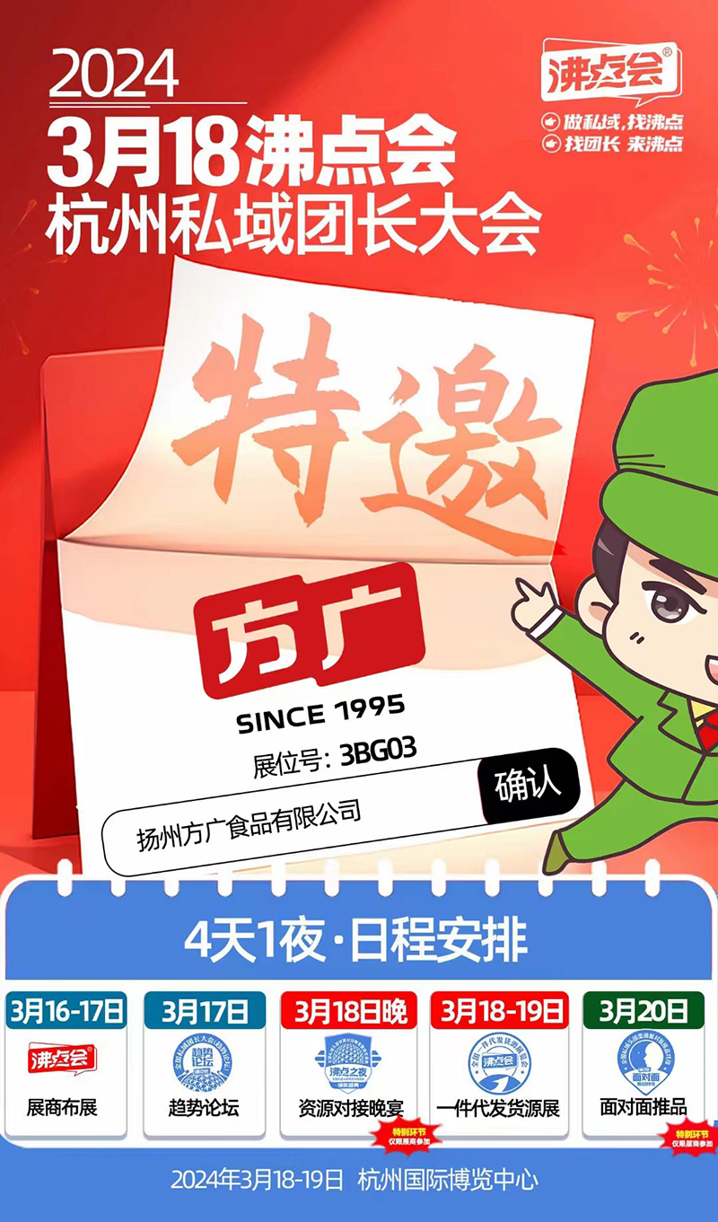 揚(yáng)州方廣食品有限公司受邀參加即將于3月18日在杭州國(guó)際博覽中心舉辦的沸點(diǎn)會(huì)之杭州私域團(tuán)長(zhǎng)大會(huì)。此次大會(huì)旨在探討私域流量運(yùn)營(yíng)、團(tuán)長(zhǎng)模式創(chuàng)新等議題,方廣作為嬰幼兒輔食行業(yè)的佼佼者,將展示多款明星產(chǎn)品。方廣展位號(hào):3BG03,熱烈歡迎蒞臨指導(dǎo)。